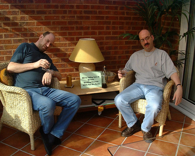 | Taking Good Care of Wedding Presents Yes, it is Gary's prized bottle of Loch Dhu! Maybe entrusting it to Ian and Grahame was not such a good idea after all…. Photo provided by Ian
